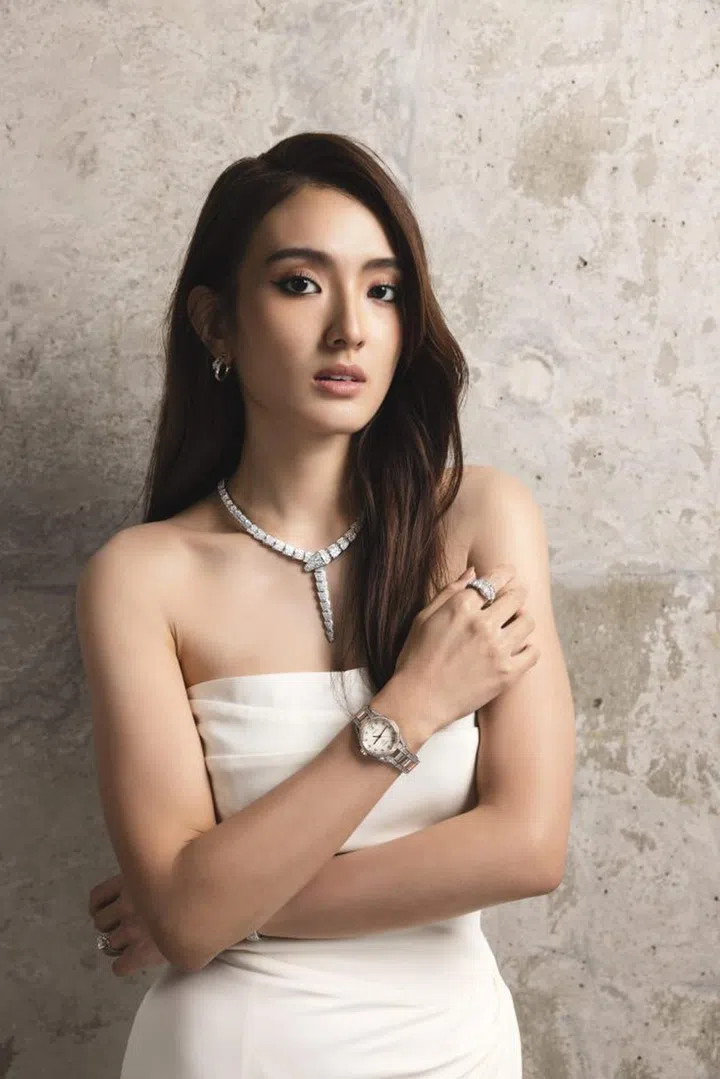 洪凌和张奕恺刚从韩国济州岛拍完婚纱照回国,并以白色情侣造型出席红星大奖。洪凌穿着澳洲品牌Manning Cartell的白色抹胸开衩礼服,搭配Bulgari祖母绿鳄鱼皮晚宴包,并与张奕恺一同佩戴Bulgari珠宝及TAG Heuer腕表。