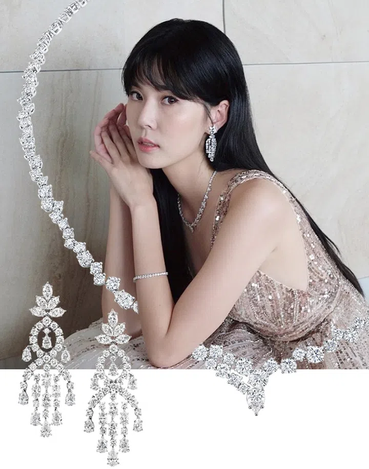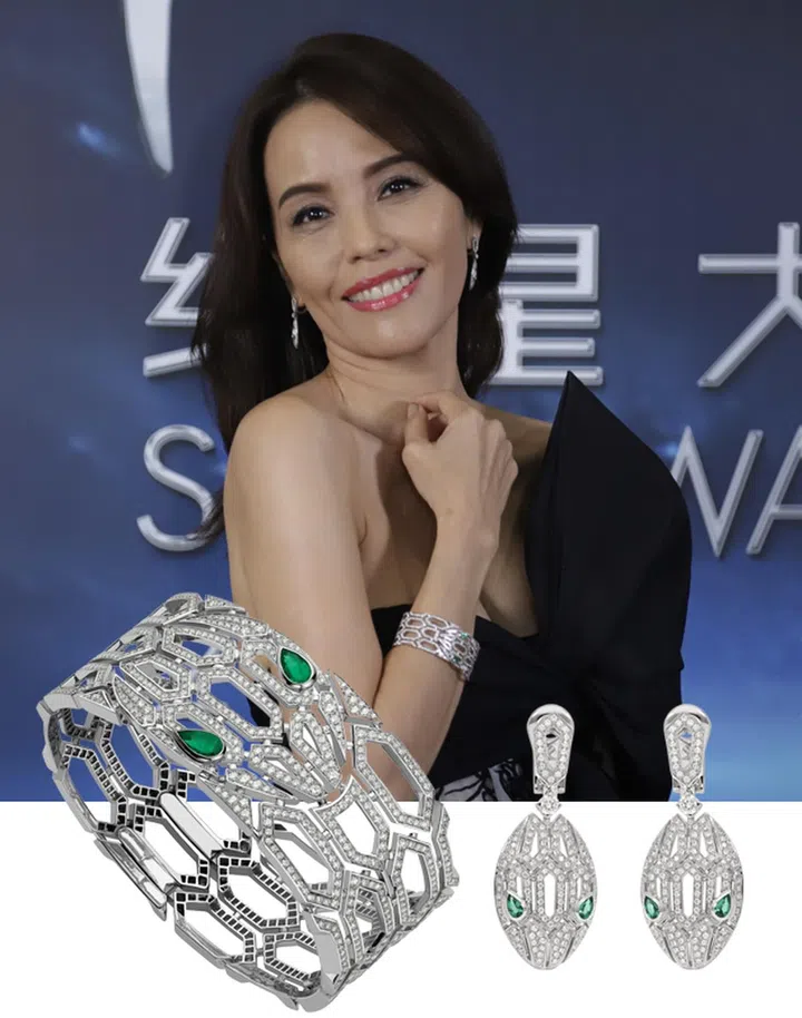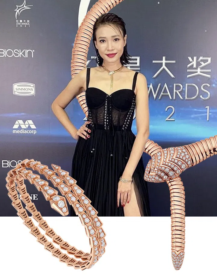 当晚赢得最佳女主角的郑惠玉,穿上柔美的Carolina Herrara蝴蝶结花卉礼服,并佩戴Bvlgari经典灵蛇钻石珠宝,大展女王风范!