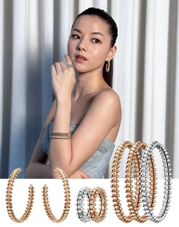 戴Cartier Clash de Cartier玫瑰金耳圈 $10,700、小型白金戒指 $3,250、小型玫瑰金戒指 $3,050、玫瑰金手镯 $12,500、白金手镯 $13,400