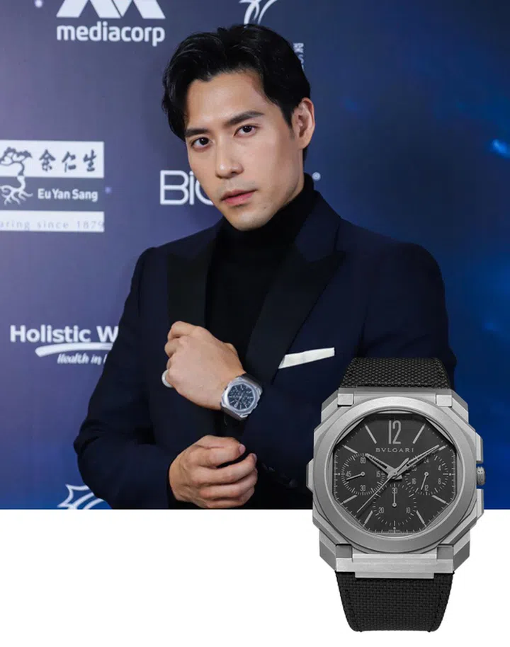 谢俊峰身穿Celine深蓝西装亮相《红星大奖》,以Bvlgari Octo黑表盘及表带腕表,巧妙呼应西装外套的黑翻领。