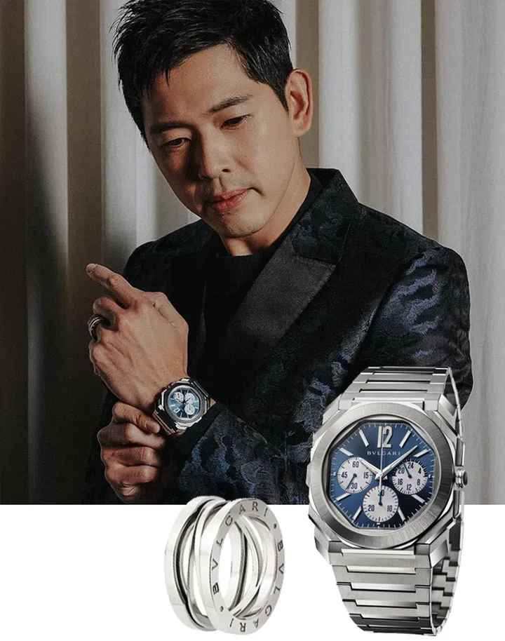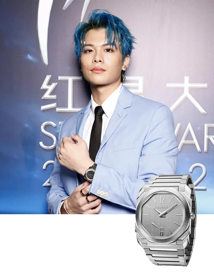 新晋演员容启航同样选择以Bvlgari Octo腕表搭配这身韩系男团造型,全精钢的款式既帅气,也趣味地呼应耳上的Ambush玫瑰安全别针耳坠和铁质发饰。
