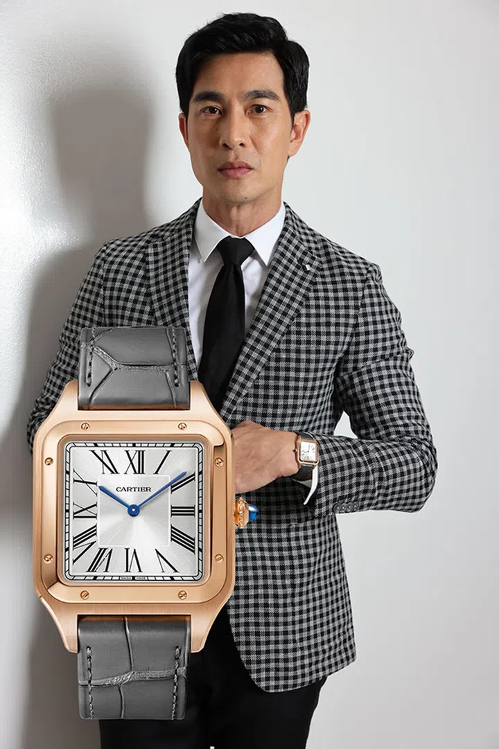 方展发在《红星大奖2022》夺得十大最受欢迎男艺人奖,在领奖时还可爱地感谢家里的两只爱犬。红毯上,他穿上了BOSS的格纹西装,经典绅士打扮配上Cartier Santos-Dumont超大型粉红金表壳,皮革表带腕表,很有型!
