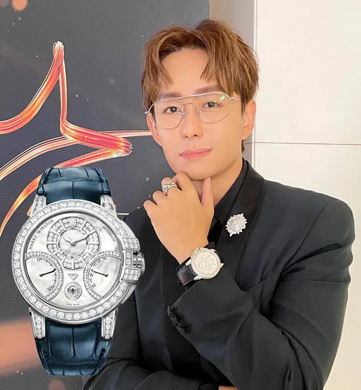 田铭耀选择以Harry Winston Ocean Biretrograde 18K白金与珍珠,42mm腕表搭配Dolce & Gabbana 西装出席《红星大奖2022》。在西装外套翻领上,他巧妙地将Harry Winston Ultimate Emerald Signature 18K白金与钻石腕表作为胸针佩戴!