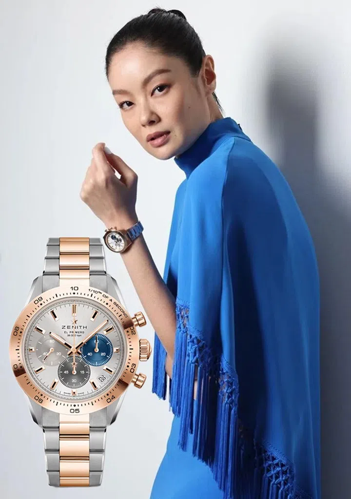 沈琳宸穿着Paris-based新加坡设计师Andrew Gn的斗篷式流苏连身裙,搭配上本地珠宝品牌Madly首饰。手腕上选择了Zenith Chronomaster Sport 41mm玫瑰金及黄金自动机芯腕表,与整体造型的高雅奢华感相呼应。