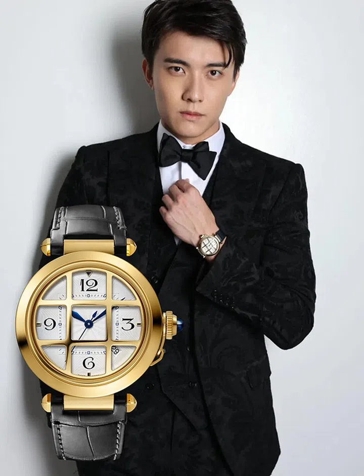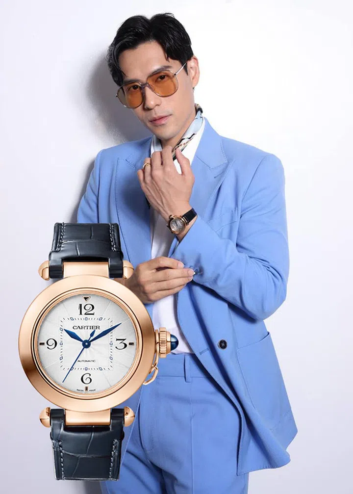 《红星大奖2022》当晚,张哲通穿上Dolce & Gabbana西装,手腕上佩戴着亮眼的Pasha de CARTIER Grid 41mm 黄金表壳及皮革表带腕表,衣冠楚楚的整洁造型大展“高、富、帅”!