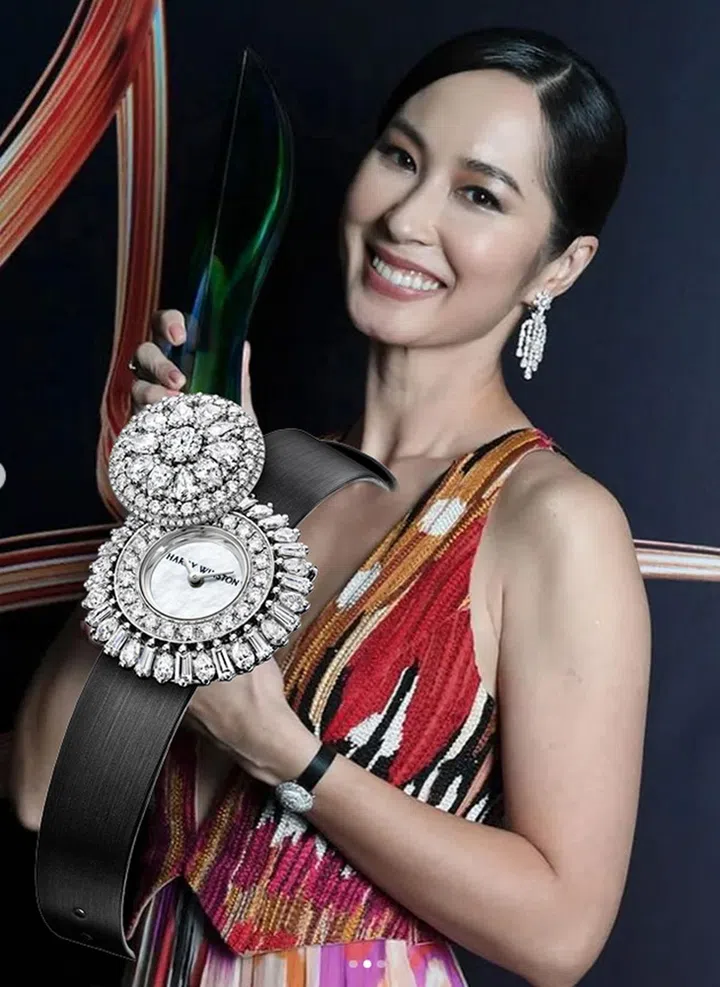 蔡琦慧获得十大最受欢迎女艺人奖,领奖时穿上大胆的Etro连身裙,佩戴着Harry Winston珠宝,以及Harry Winston Rosebud 18K白金及珍珠母贝表盘,镶嵌钻石黑色缎面表带,精致搭配大展典雅时尚。