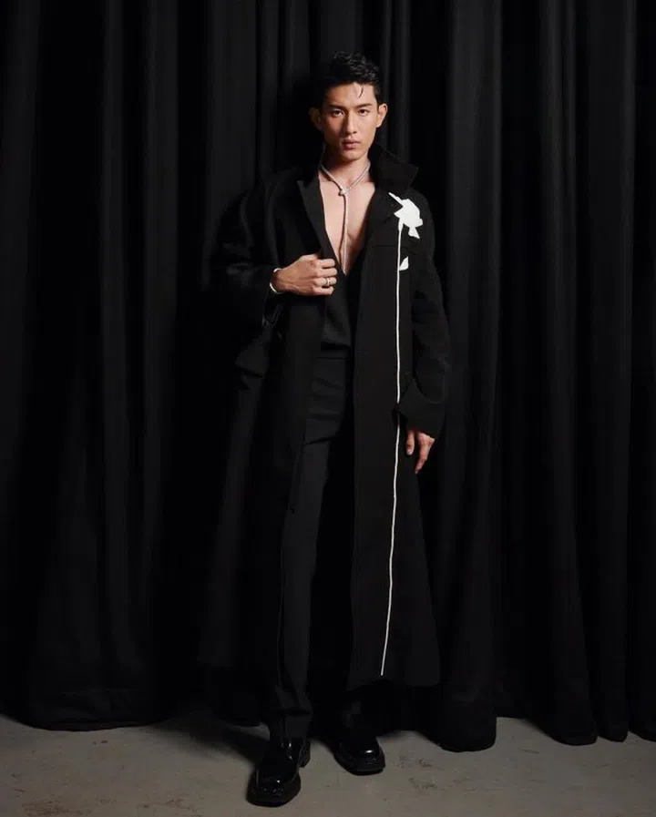 孙政的《红星大奖2024》造型一黑一白,两套都来自Valentino。其中这身气势十足的黑色大衣造型,胸前装饰醒目白色花卉,与他佩戴的Bulgari Serpenti高级珠宝巧妙呼应。
