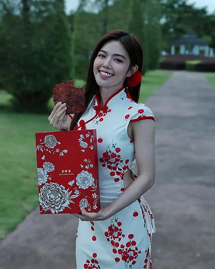 农历新年期间,她选穿腰部带挖洞设计的现代旗袍,让本就修身且具女人味的旗袍,更多一份性感妩媚。
