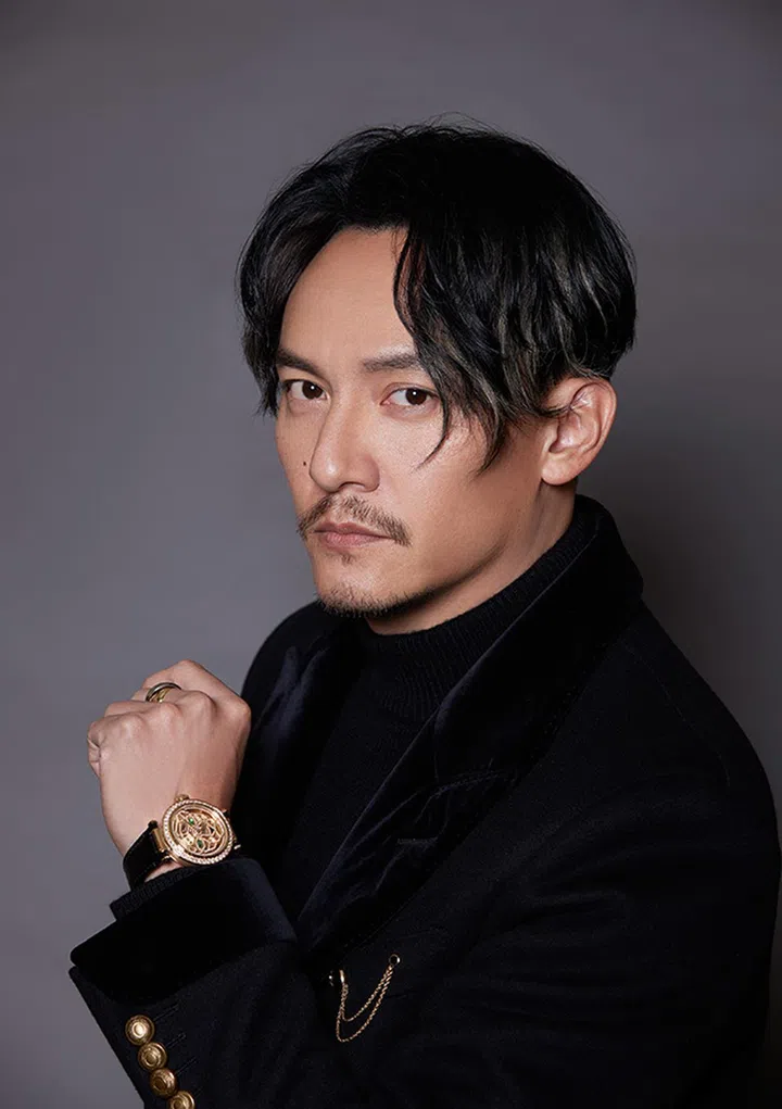 张震佩戴Pasha de Cartier 41mm表径的手动上链机械机芯镶钻黄金镂空腕表,Panthère de Cartier pocket gem镶玛瑙及沙弗莱石黄金胸针,Trinity三色金(白金、黄金、玫瑰金)大型戒指。
