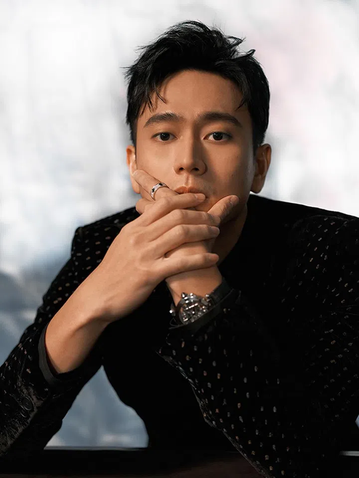 林柏宏佩戴Pasha de Cartier 41mm表径自动机械机芯精钢计时码表(配备可替换的表链及表带),Faune et Flore de Cartier镶钻铂金胸针,以及Trinity白金及陶瓷中型戒指。