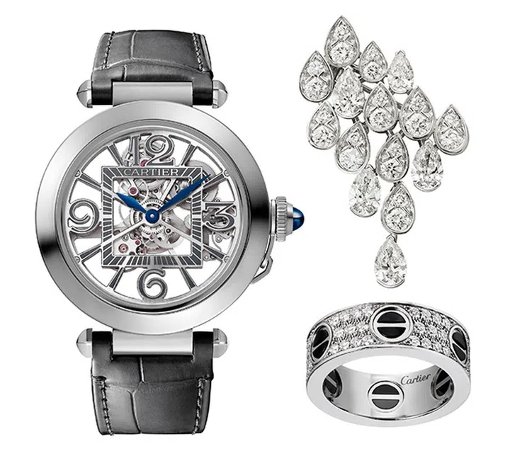刘冠廷佩戴Pasha de Cartier 41mm表径的自动上链机械机芯精钢腕表,搭配Pluie de Cartier镶钻白金胸针,以及LOVE系列镶钻及陶瓷白金戒指。