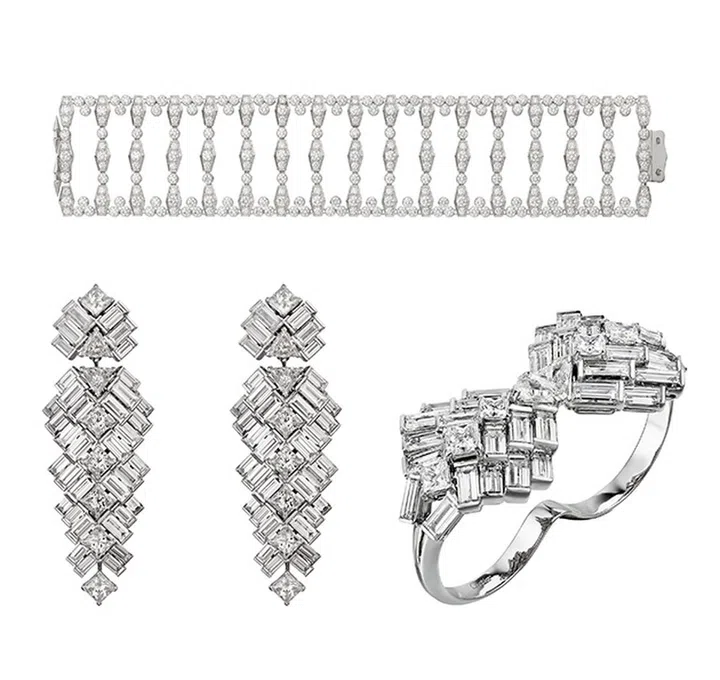 陈庭妮佩戴Reflection de Cartier系列镶钻白金耳坠及戒指,还有Pluie de Cartier镶钻白金手链。该系列主要运用几何设计,来凸显首饰的华美。