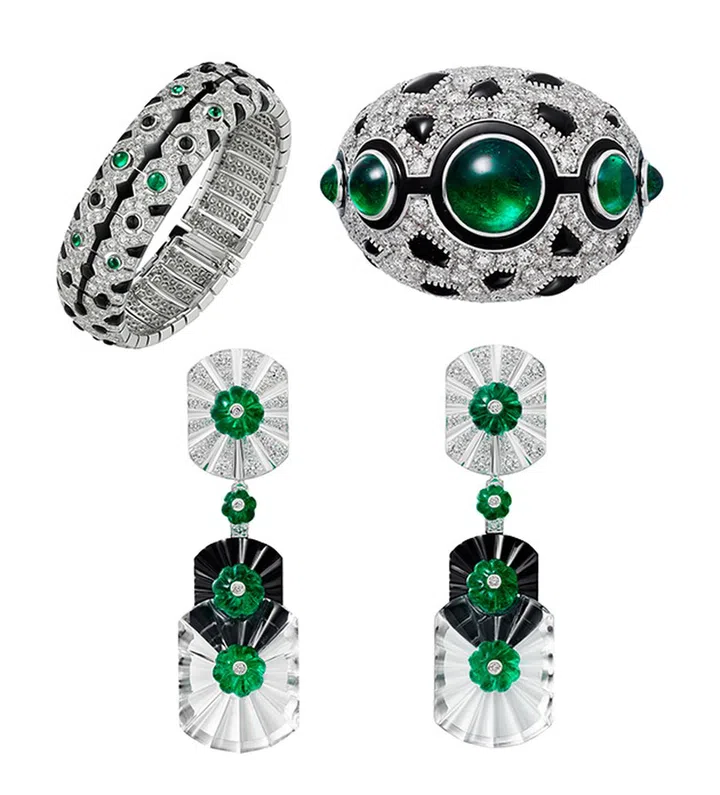 陈庭妮佩戴Sixième Sens par Cartier镶钻、玛瑙、祖母绿及水晶白金耳坠,[Sur]naturel镶钻、玛瑙及祖母绿白金手镯和戒指。该系列着重意象之美,旨在展现珠宝与佩戴者之间的亲密联系。