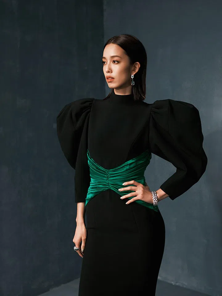 这套服装陈庭妮穿着Andrew GN最新的2022春夏黑色礼服,超夸张袖型极具高级感,搭配品牌的Sixième Sens par Cartier系列首饰,尽显复古优雅。