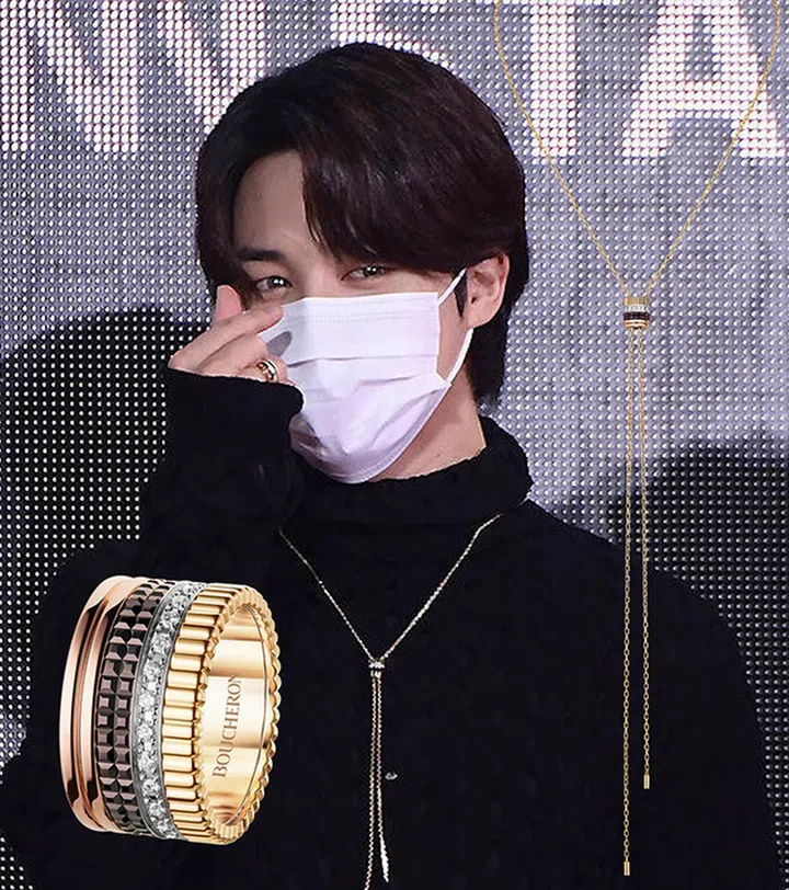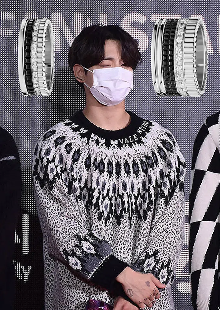 Jungkook同时佩戴了Quatre系列Black Edition的大型及小型戒指,这两款戒指以白金及黑色PVD打造,并镶嵌璀璨钻石。用来搭配他的炫目毛衣,色彩也极为相衬。