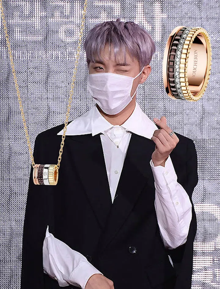 其中J-Hope佩戴了Quatre Classique系列的小型戒指,这款戒指糅合黄金、白金、玫瑰金及棕色PVD多种色调,并装饰密镶钻石。另外,胸前的项链也与其戒指低调呼应, 令造型更加完美。