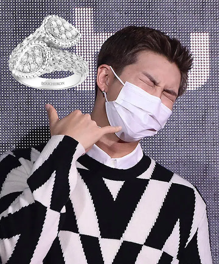 Jin佩戴Serpent Bohème镶钻黄金戒指,仅以简单珠宝点缀造型。这款看似女性化的设计,在他手上也显得格外帅气。