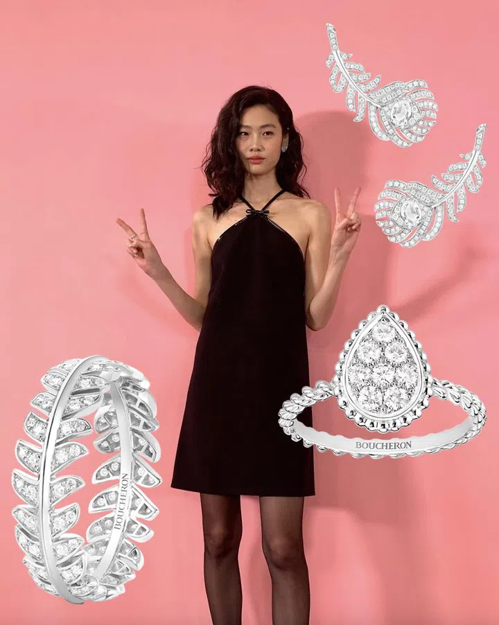 近日《鱿鱼游戏》演员出席美国电视节目《Tonight Show Starring Jimmy Fallon》,郑浩妍和李政宰都以黑色造型亮相,并佩戴Boucheron珠宝。其中,郑浩妍选戴的是品牌Plume de Paon系列耳扣及戒指,还有Serpent Bohème系列戒指,皆为镶钻白金款式。