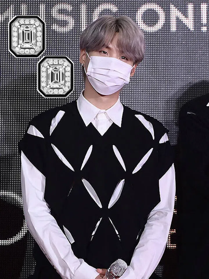 觉得男人戴耳钉也特别迷人?Suga就佩戴了品牌的Vendôme Liseré镶钻白金耳钉。该设计采用了经典的八边形轮廓,中心为祖母绿切割钻石,并包围圆形钻石,排列组合中尽显几何美感,