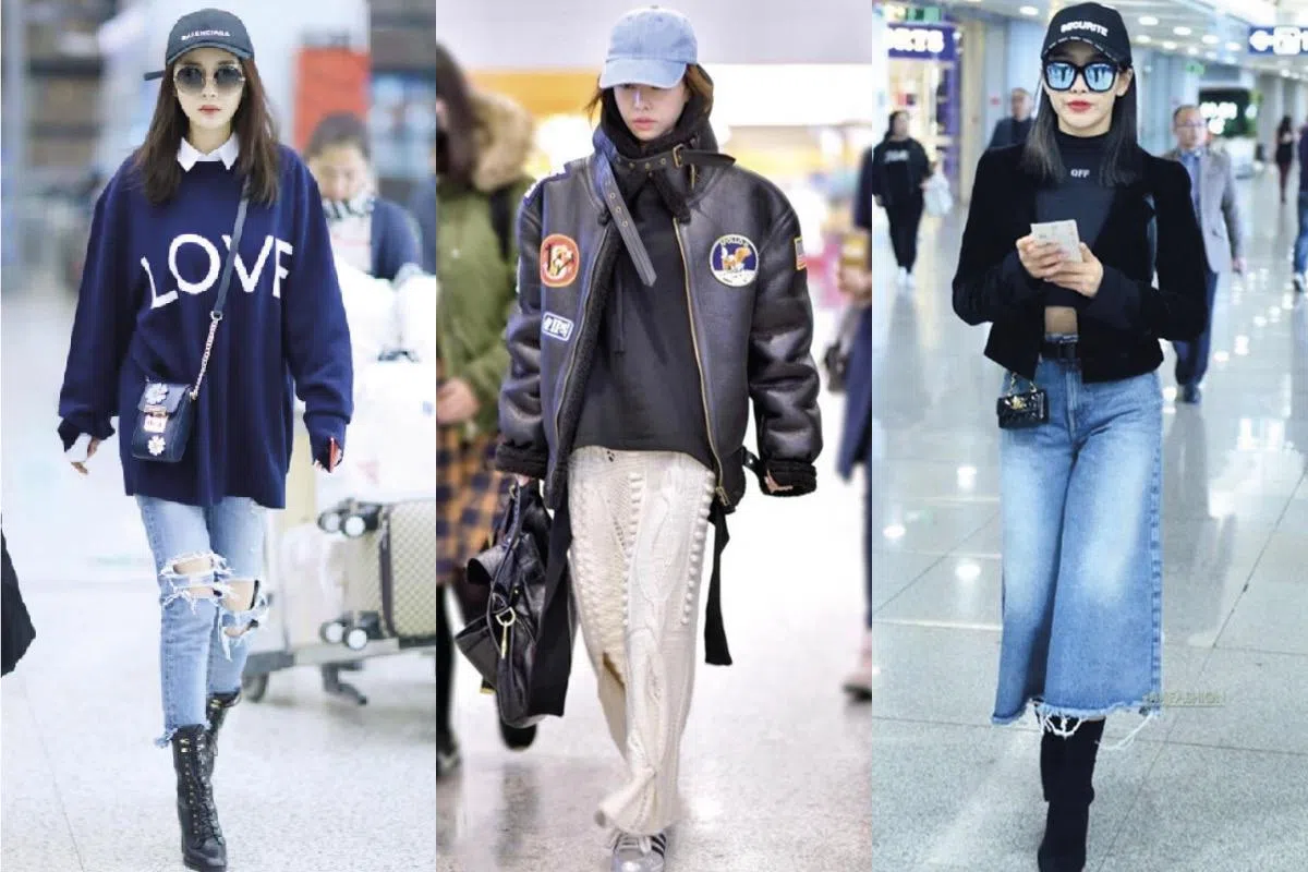 在飞机上睡觉会把发型压扁?别愁,棒球帽是你的救星。唐嫣穿上Vetements的oversized飞行外套搭配黑牛仔裤及棒球帽,时尚现身机场。