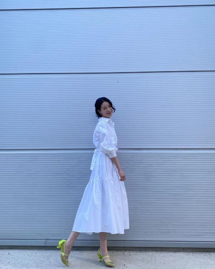 简单大方且容易搭配的连衣裙一直是上班族必选的单品之一。林智妍的这条纯白娃娃裙下摆飘逸,尽显知性大姐姐的温柔和优雅。怎么穿单色连衣裙才不会boring?可以选择一处作为亮点,就像林智妍选穿了一双绿色的高跟鞋,为整体造型添入些别样韵味。