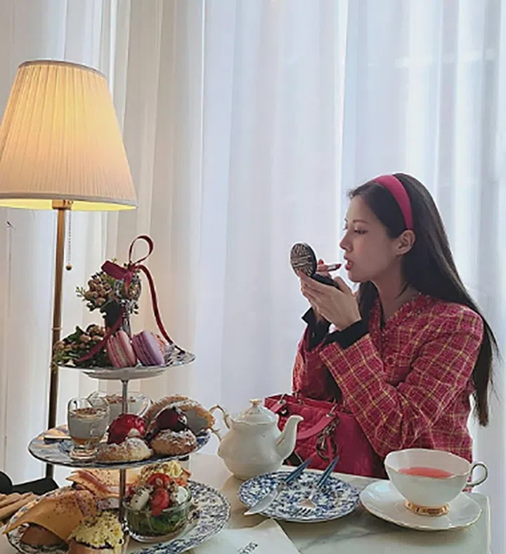 歌手兼演员徐贤的穿搭倾向柔美优雅风格,以她的这款穿搭为例,全身一致性的紫红色调,通过不同材质塑造穿搭的细节感。如果担心紫红色难以驾驭,小编推荐大家选择温柔的粉红色调,打造从头到脚的单色系造型。