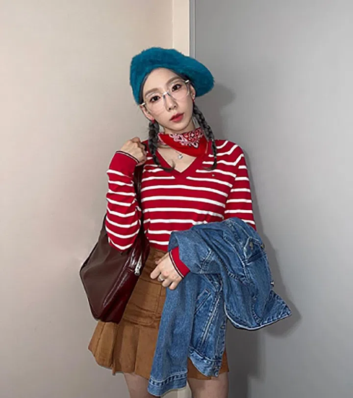 文艺女孩看过来!Taeyeon一身法式学院风的穿搭,让上班心情也变得美丽。重点单品有超大框眼镜、洋溢文艺气息的贝雷帽和经典的条纹上衣。推荐选择温暖的大地色系,让穿搭更具时尚复古魅力!