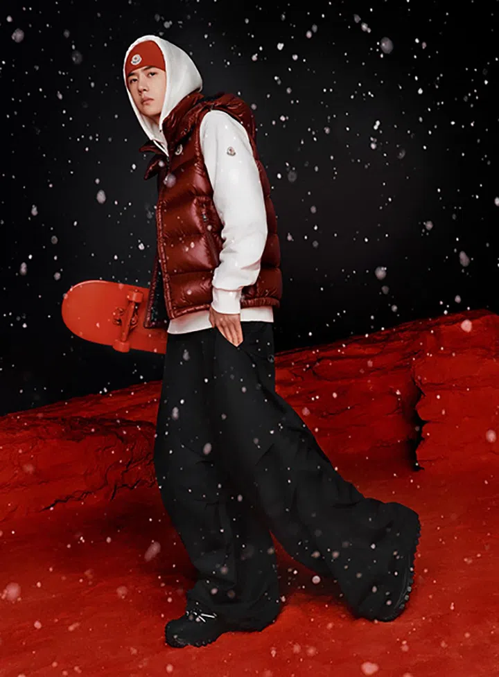 Moncler新年则选用经典动画形象Roger Rabbit为主角,推出潮趣盎然的全套造型限定系列(含男女装及童装),并邀全球代言人王一博拍摄系列广告,展现新年的多变风采。其中包括嵌花针织开衫、运动服、T恤和连帽衫,外加棒球帽及趣味图案袜,让你演绎出青春无限的学院风格。