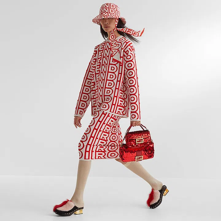 Fendi新年以红白为主色开启新年鸿运,并将Marc Jacobs在Baguette 25周年系列中重新诠释的Fendi Roma logo大胆运用于成衣及手袋。比如短版平纹套衫、针织套衫、针织短裙,还有Baguette手机袋、Sunshine迷你手机袋等小巧袋型。