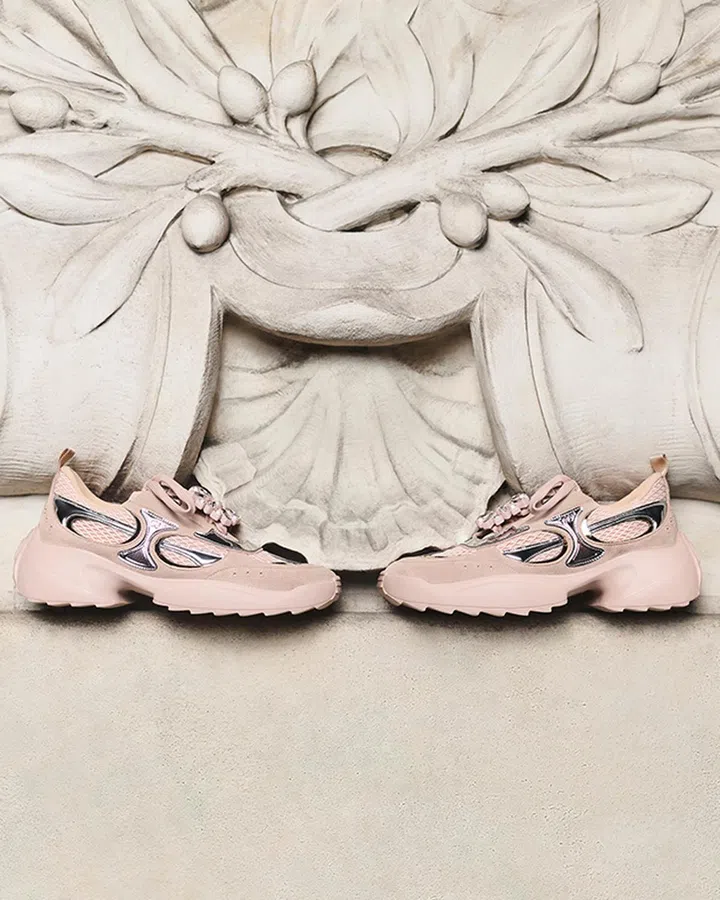 Roger Vivier全新推出Viv’ on the Run运动鞋,融合复古运动风与现代优雅,打造兼具时尚感与舒适度的百搭单品。鞋面采用柔软皮革与透气网眼材质,搭配轻盈 EVA 鞋底,让步伐更加稳健轻盈,同时融入弧形鞋底设计,提升行走舒适度。鞋带点缀可拆卸装饰扣,提供水晶款与简约款可选,增添个性化细节。系列推出银色、玫瑰金、黑白拼色、裸粉金色,低调又富有光泽感,赋予造型更多可能性。