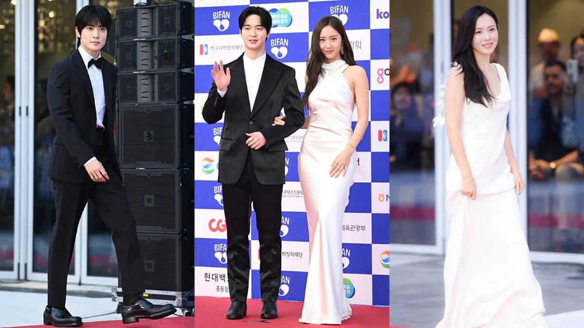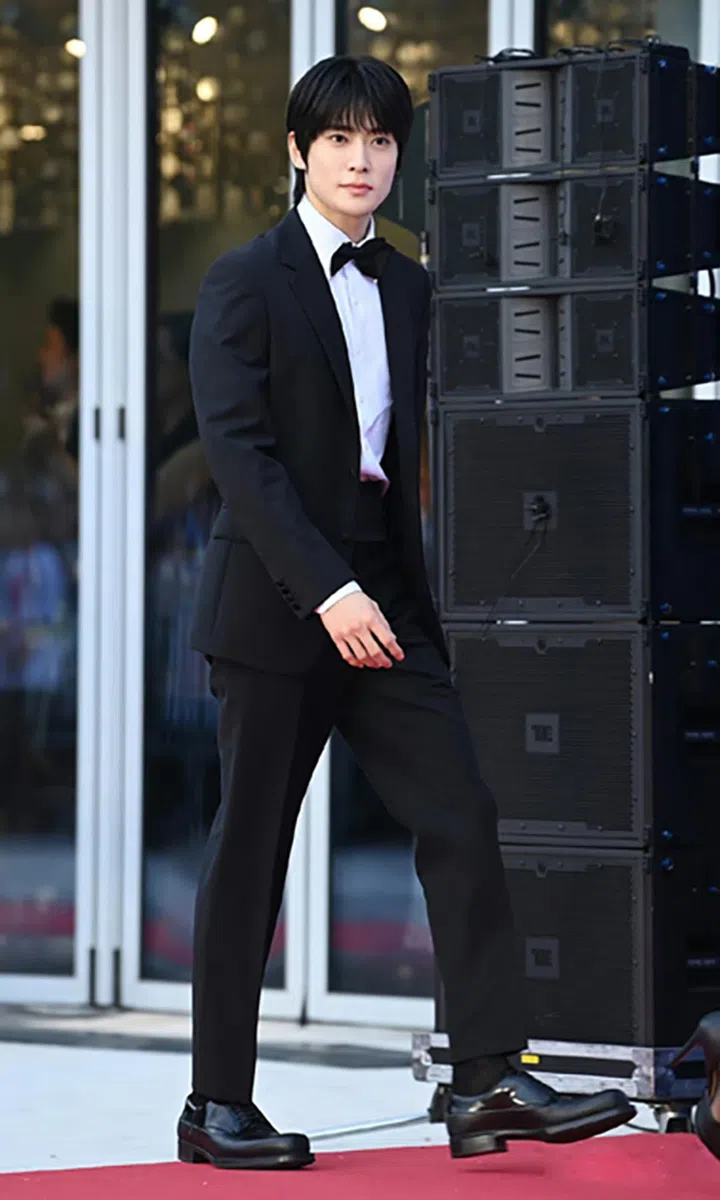 同样挑战大银幕的,还有出演温暖家庭电影《Beautiful Audrey(世上最漂亮的奥黛丽)》的朴志训。他以黑白条纹领带搭黑西装出席红毯,展现松弛自在的年轻态度。