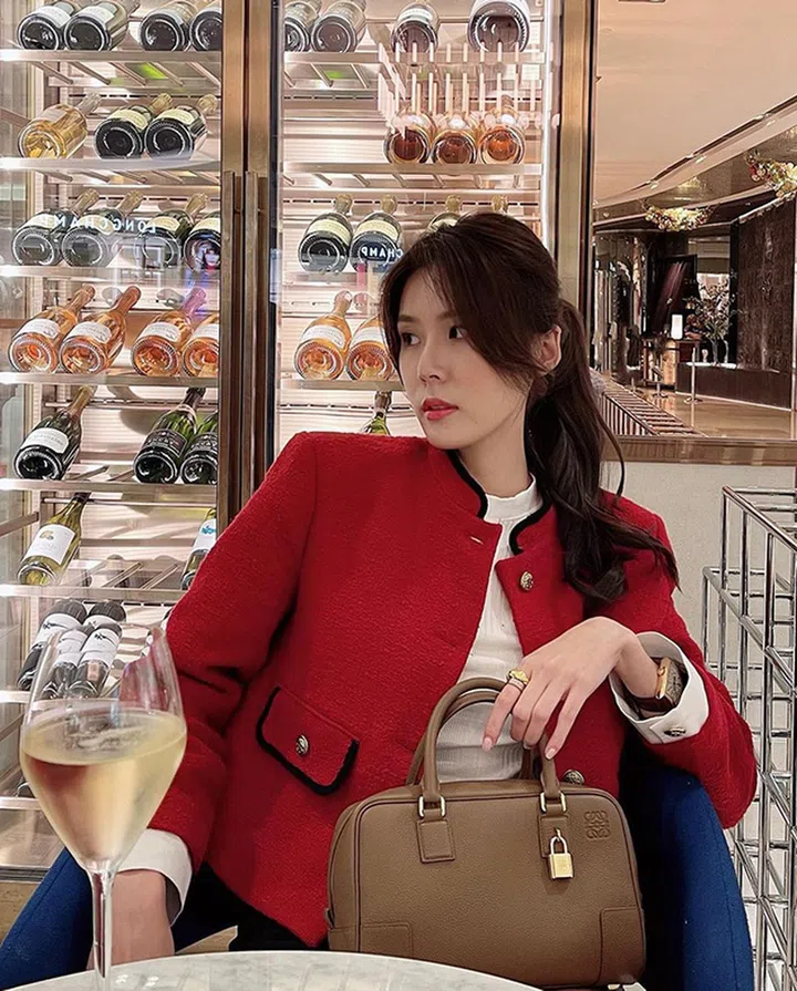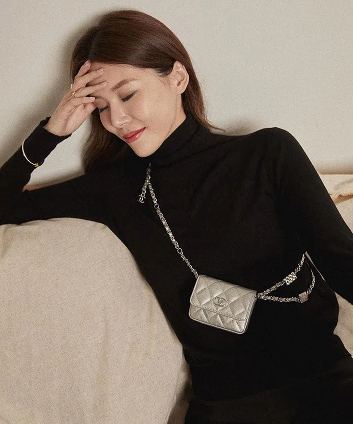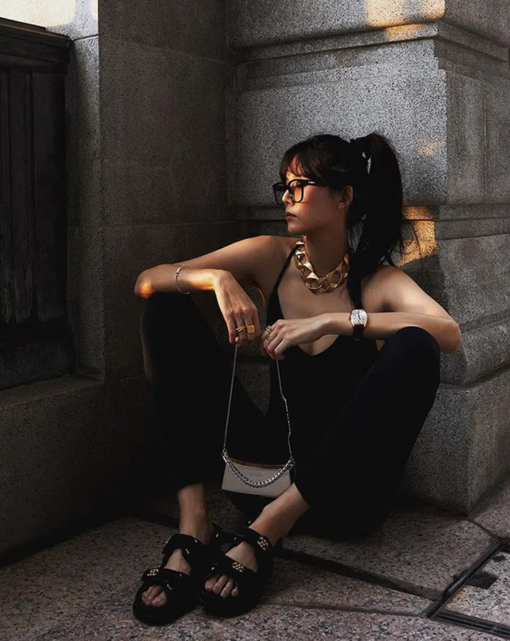 小包风潮流行不退,这款包包其实是早前Chanel推出的迷你链式腰袋,黄思恬换种方式当斜挎包背也一样好看。银色小包在黑色上衣的衬托下,既有节日感又不失经典气质。