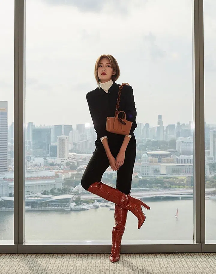 常常在韩剧中出镜的The Curve手袋,设计灵感来自马具元素。黄思恬用西装及黑白背景巧妙演绎手袋的黑白配色,造型简洁,照片也散发高级感。