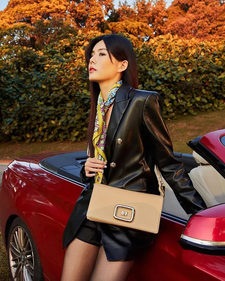 这款来自Roger Vivier的新款包包,本地艺人林慧玲近期也有携带。其袋型大气、干练,学黄思恬搭配帅气外套,再以一条印花丝巾为造型做点缀。