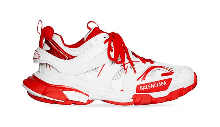 这款Balenciaga特别为情人节打造的Valentine's Day 22 Track Trainers,采用红、白结合的网面及尼龙材质,鞋后跟压印“BB”品牌标记,且鞋面和鞋舌均带有“Balenciaga”字样。