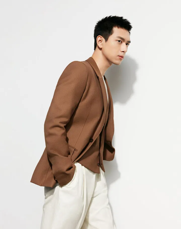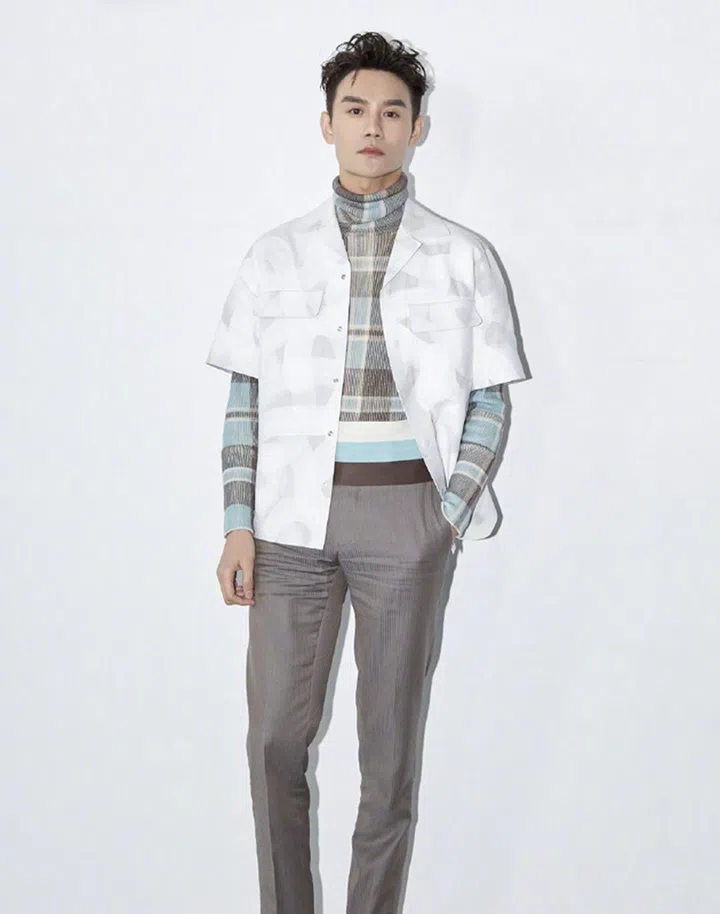 同样以褐色西装外套“宅家”看秀的李现,选择以Ermenegildo Zegna同色背心外套及白西裤搭配,大展时尚公子范!