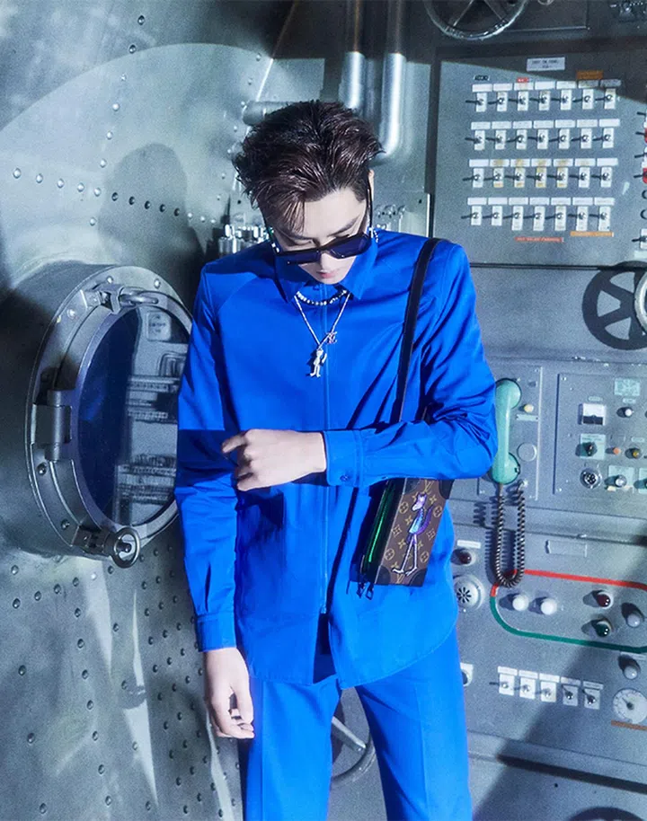 吴亦凡以一袭宝蓝色Louis Vuitton 2021春夏系列套装亮相,卡通The Adventures of Zoooom with Friends包包及首饰的搭配,为工装造型注入阳光少年朝气。