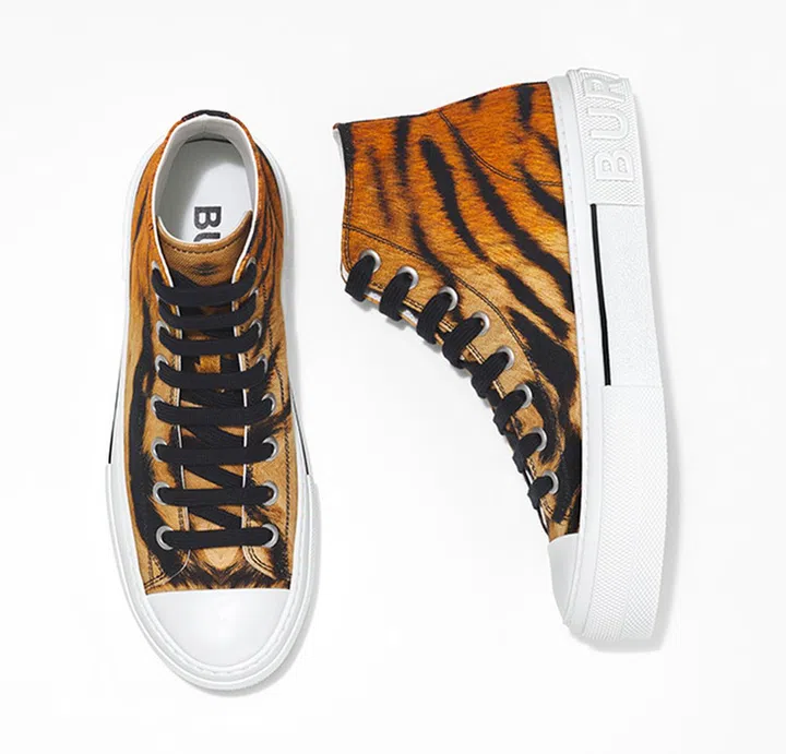 以100%棉质制作的舒适高筒球鞋,鞋跟处饰有 Burberry字母压花徽标,鞋身的抢眼虎纹可与身上的其他虎纹单品巧妙呼应(比如点缀虎纹TB标志的纯白T恤)。
