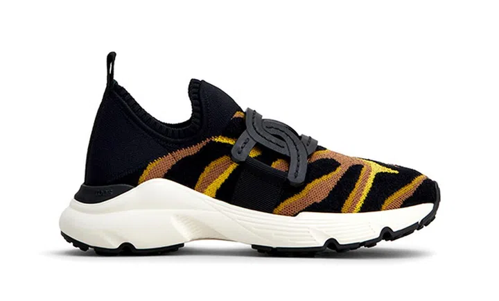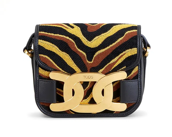 Tod's为虎年推出限量新年系列,包括各种材质丰富的乐福鞋、球鞋以及手袋设计。这款以黄、棕、黑色调印花织物拼缝而成的小巧斜挎袋,采用磁力扣点缀手袋翻盖,开合方便,并带有可调节肩带。