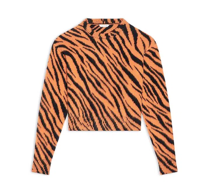 Balenciaga虎年系列也包含大量的橘色调虎纹单品,从衬衣、衬衣裙、套衫、外套,到袜子、拖鞋、针织帽,选择非常丰富。另外还有一款牛仔夹克,仅在内衬使用橘色虎纹,也非常有收藏价值。