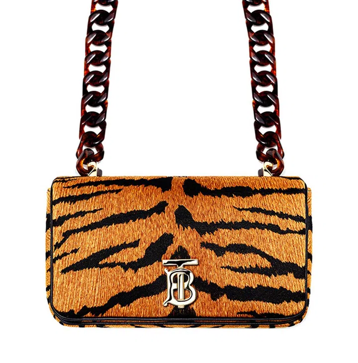 Burberry选用棉质装饰虎纹元素打造Lola手袋,经典TB包扣抢眼又有辨识度,另外搭配精美又轻盈的肩背链条,让你打造酷味十足的虎年造型。