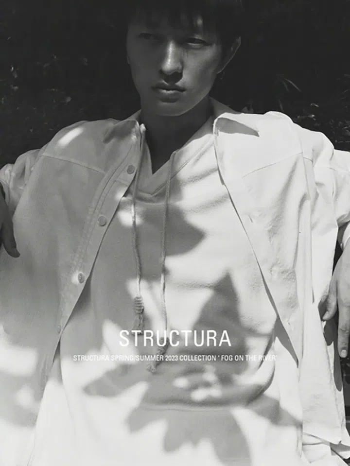 两人社交平台上最具诗意的“新照”,是为时尚品牌STRUCTURA拍摄的系列形象画。该品牌由金大川联合设计师Wawa创办,品牌名将“structure”一词改写,并以中性、极简、现代又浪漫的风格打造“身体建筑”。
