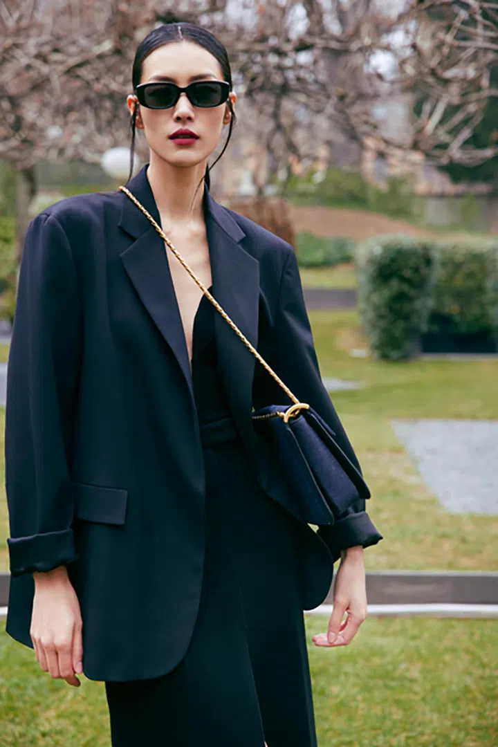 刘雯身穿Gucci定制系列丝绒礼服搭配Gucci Bamboo 1947手袋,在第三空间“伊甸花园”(Room 3 – Eden)领略品牌与美丽自然世界的关联。这款风格复古的典雅丝绒连体造型,剪裁高贵又“毫不费力”,收腰设计干净利落地展现出纤美腰身,同时帅气的裤装和肩型也完美诠释出女性的干练气质。
