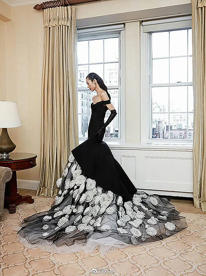 作为Met Gala常客的刘雯,今年已经是第11次亮相盛典。今年她穿着Tory Burch定制礼服,这款礼服优雅地衬托出她的天鹅颈和一字肩,虽然瘦削,但裙摆内里的山茶花如瀑布倾泻,展现柔美又富有爆发力的力量感。另外, 她所佩戴的花朵状耳坠还是来自设计师Tory Burch本人的珍藏。