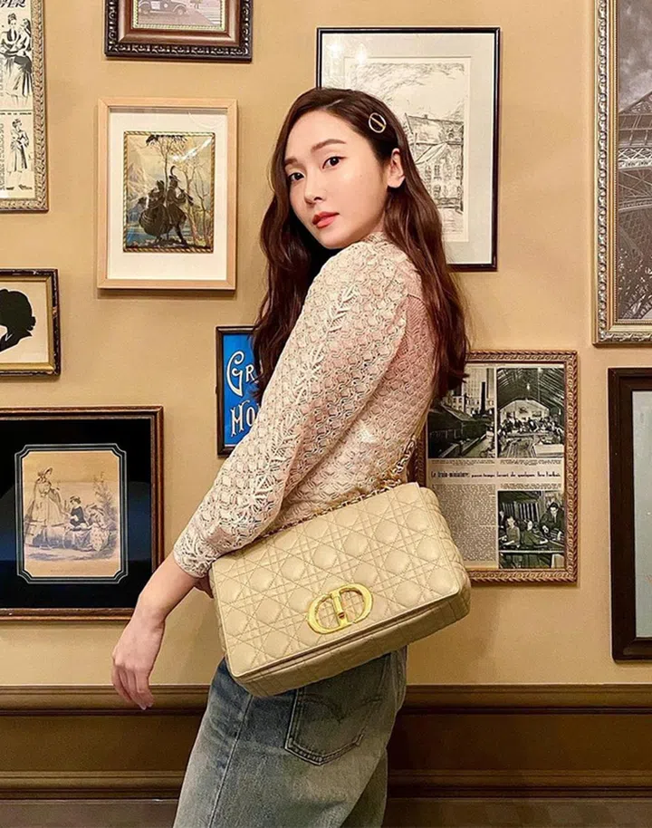 Jessica以Dior 2021早春系列蕾丝上衣呼应Caro链袋的cannage藤纹,打造休闲的“千金”造型。发现她的小心机了吗?她在头上别了品牌标记性的CD发夹,低调呼应包包的CD金属搭扣。