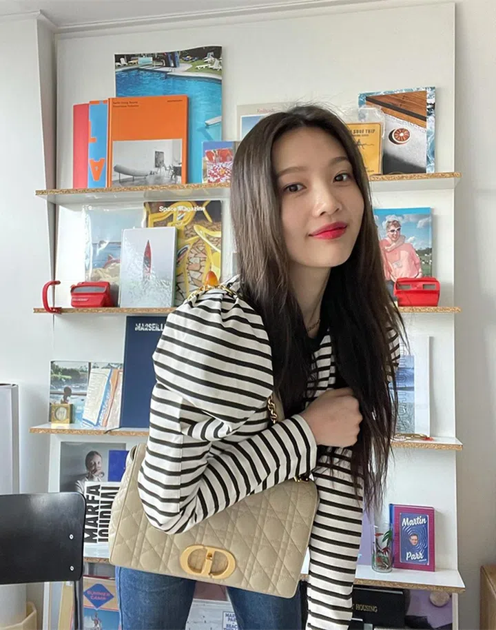 Joy同样穿牛仔裤搭配Dior全新的Caro包,巧妙以条纹上衣“撞”包包的藤纹,交叠出精彩的纹理视觉。