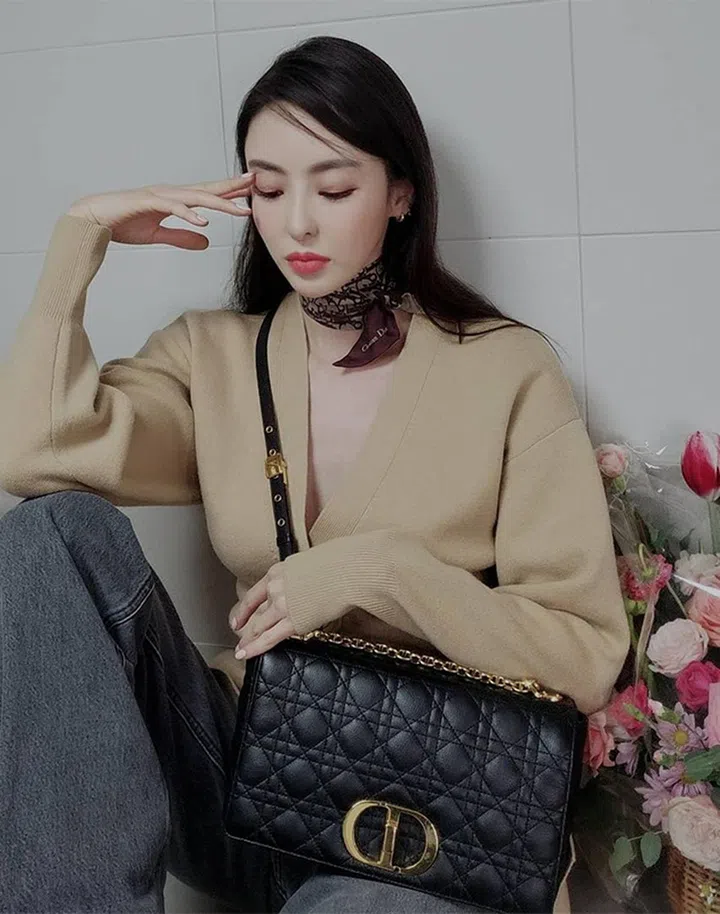 Caro其实是Dior两大经典之作的结合体——Lady Dior的cannage藤纹+30 Montaigne的CD标志。李多喜这身休闲的针织衫及牛仔裤搭配Caro包,是不是很有个性?