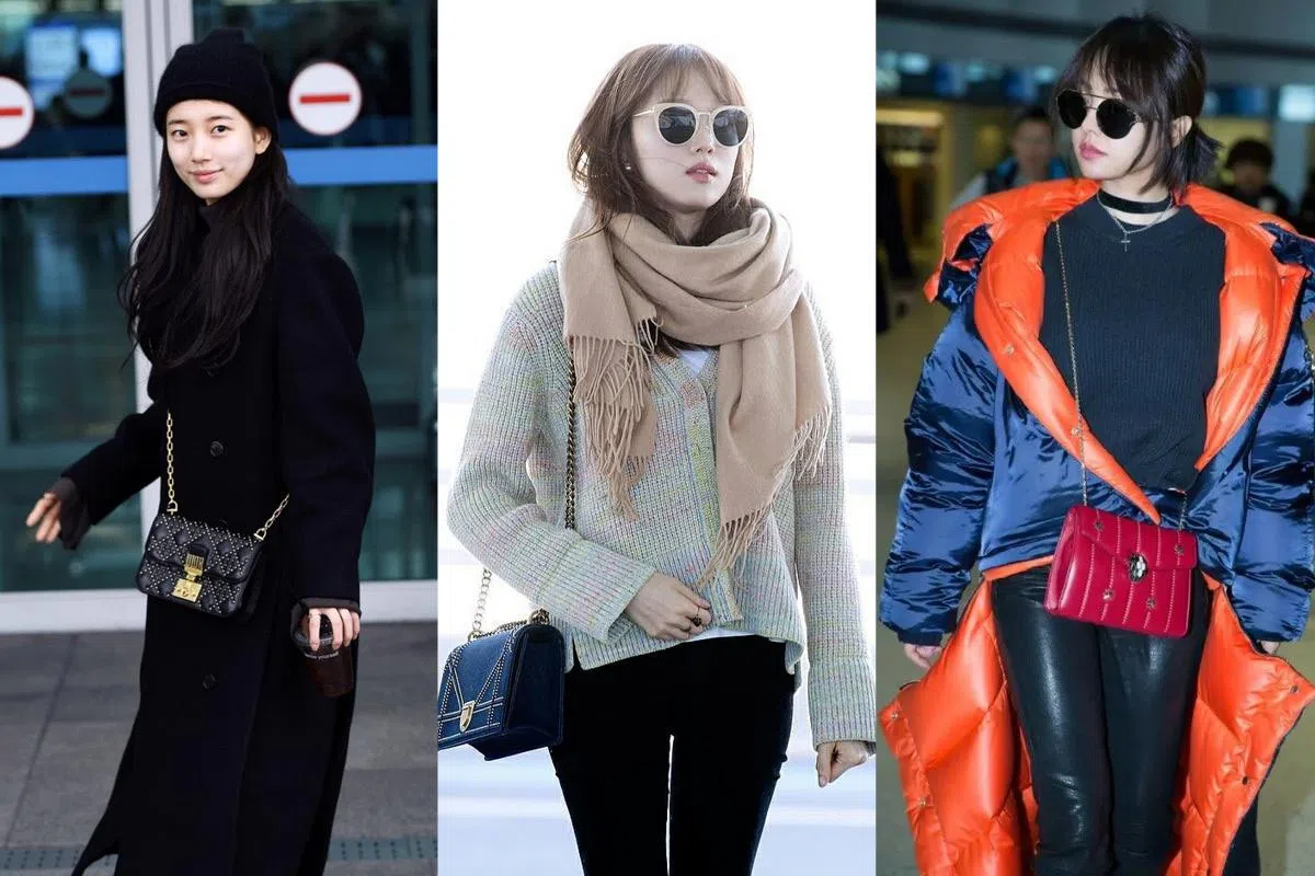 Suzy身穿Recto 2017秋冬系列黑色双排扣大衣搭配牛仔裤及黑beanie现身机场,肩上的黑Dioraddict铆钉链袋让她穿出不同层次的黑时尚。