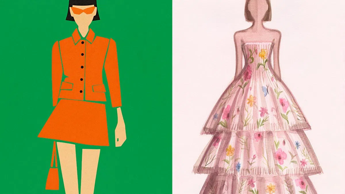 舍弃繁复背景和装饰元素,他选择聚焦在服饰并专注于对时装本质的纯粹追求。看似简单的线条和着色其实大力强调服饰上的细节——无论是蕾丝的精致、刺绣的复杂、皮革的质感及裁剪的建筑美感,他致力于通过水彩及拼贴的结合诠释面料的质感、表面及透明度,充分展现时装如何与身体融合成和谐又精彩的形体。