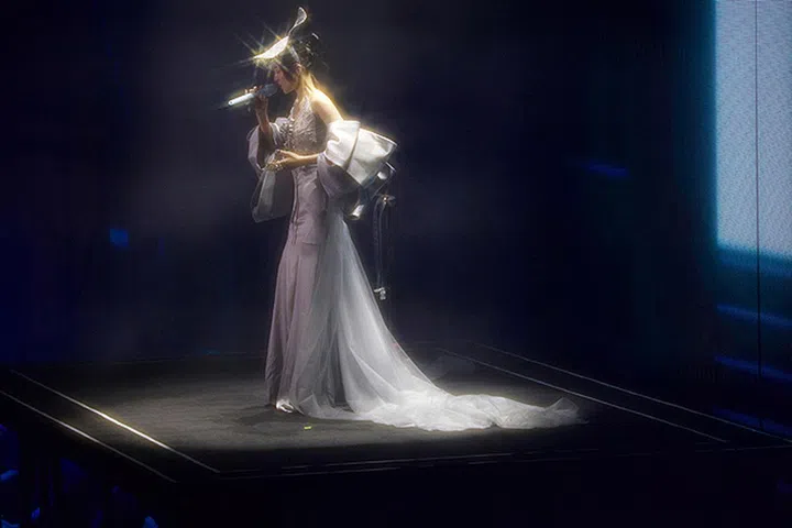 另一套“冰雪皇后”造型,也是由WINDOWSEN打造。该品牌由李森森(Sensen Lii)于2019年创立,风格前卫,擅于糅合科技元素及醒目色彩打造富有戏剧性张力的服装。Madonna、Doja Cat、Itzy、蔡依林及郑秀文等女星都曾穿着WINDOWSEN的服装。